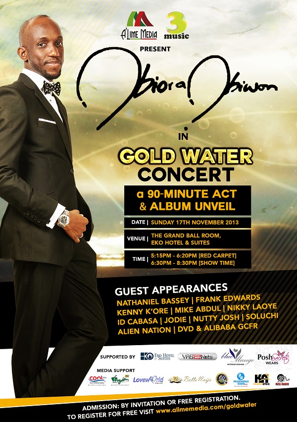 “Gold Water” will be launched with a 90-minute Concert on Sunday November 17th, 2013 at the Grand Ball Room of Eko Hotel & Suites, Lagos by 5pm. Guest appearances will be made by Nathaniel Bassey, Frank Edwards, Kenny K’ore, Mike Abdul, Nikki Laoye, ID Cabasa, Jodie, Soluchi, DVD, Alien Nation, Tochi, Victoria amongst others, with a special guest appearance by AliBaba King of Nigerian Comedy.